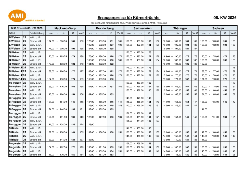 Preisentwicklung Druschfrüchte NBL KW 08 vom 20.02.2026