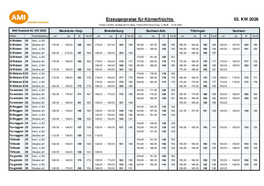 Beitrag lesenPreisentwicklung Druschfrüchte NBL KW 03 vom 16.01.2026