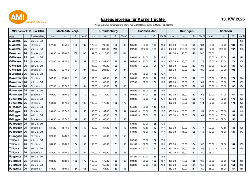 Beitrag lesenPreisentwicklung Druschfrüchte NBL KW 13 vom 27.03.2026