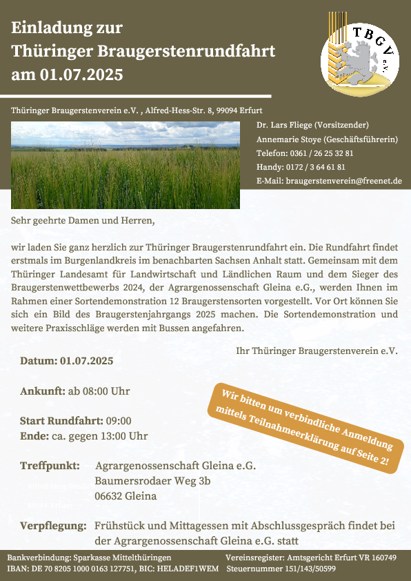 EINLADUNG Braugerstenrundfahrt 2025 mit Start um 9.00 Uhr in Gleina