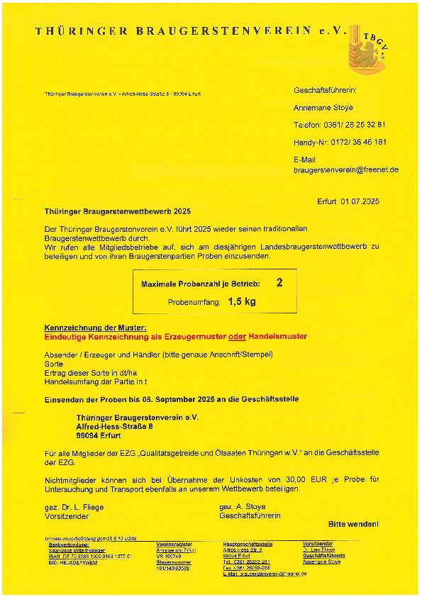 Vordruck und AUFRUF sowie Teilnahmebedingungen Thüringer Braugerstenwettbewerb 2025