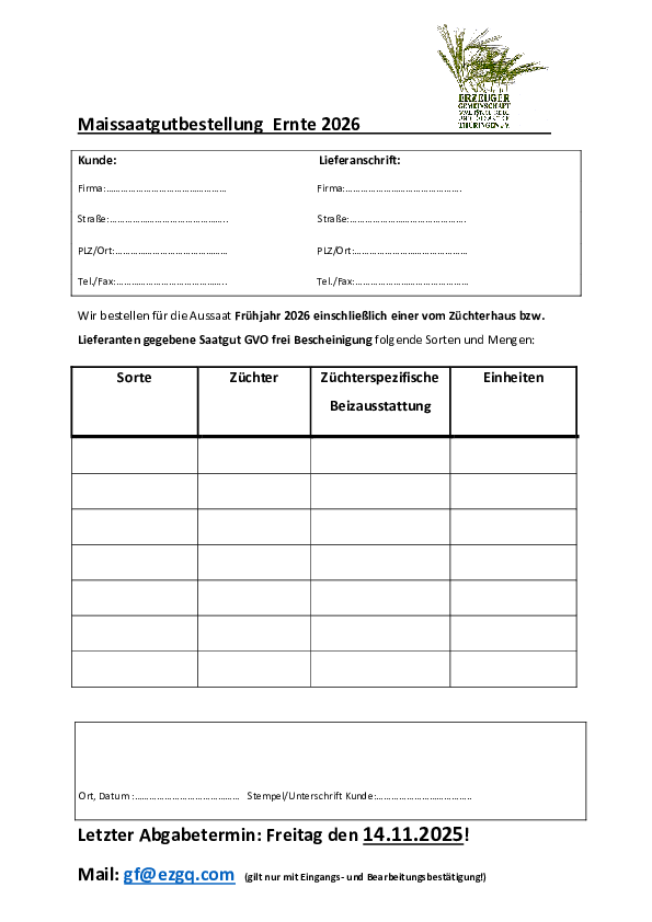 Formular Maissaatgutbestellung EZG 2025. Abgabetermin: 14.11.2025