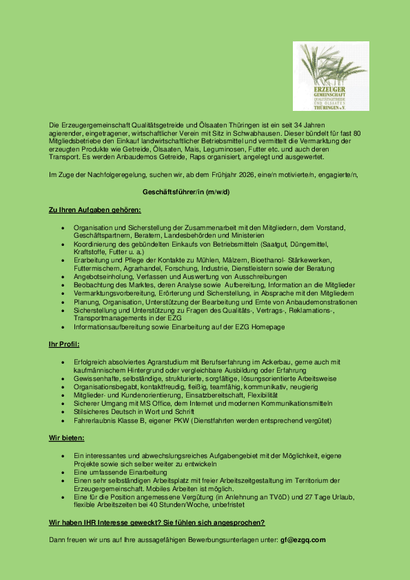 Stellenanzeige Geschäftsführung EZG ab Frühjahr 2026