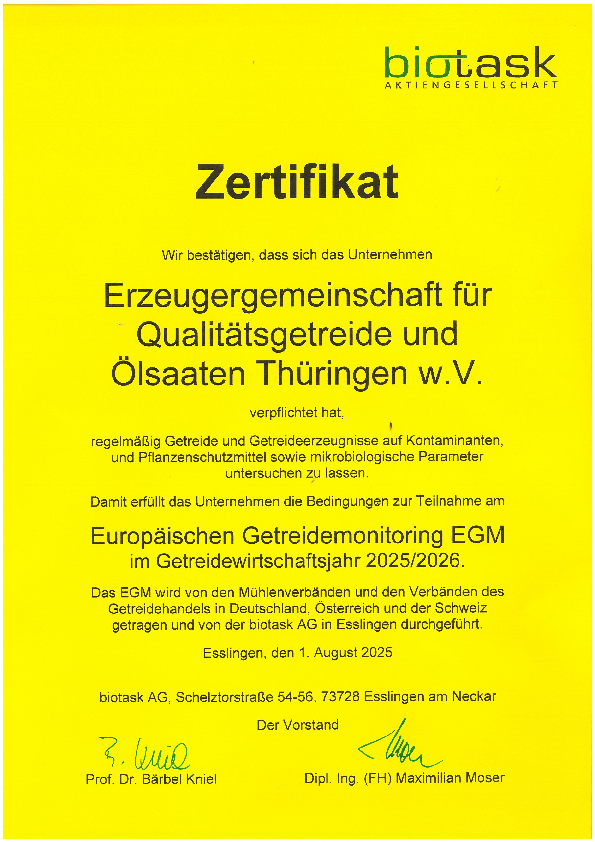 Weiterhin beteiligen sich die Mitgliedsbetriebe der EZG seit dem Jahre 2006 am Europäischen Getreidemonitoringprogramm (EGM). Hierbei werden jährlich Getreideproben bei der Firma SGS Germany GmbH, seit dem Jahr 2014 bei der Firma Biotask, auf Rückstände an Pflanzenschutzmitteln, Schwermetallen, Fusarientoxine, Mykotoxine und Mikrobiologie untersucht.